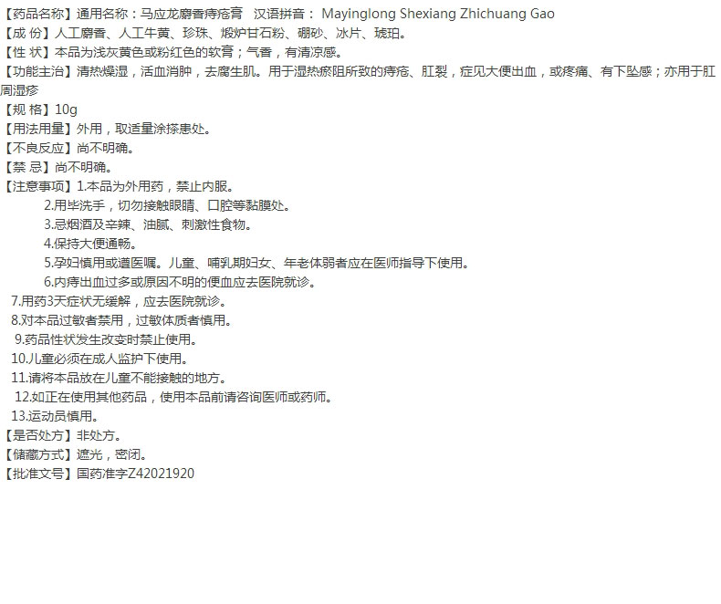 【药品名称】通用名称:马应龙麝香痔疮膏 汉语拼音: Mayinglong Shexiang Zhichuang Gao