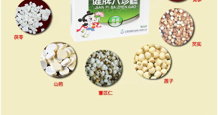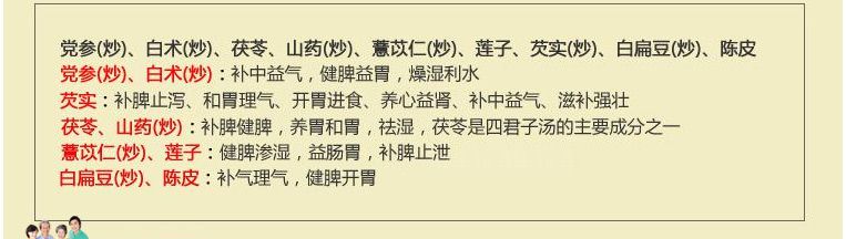 【主要成份】党参(炒)、白术(炒)、茯苓、山药(炒)、薏苡仁(炒)、莲子、芡实(炒)、白扁豆(炒)、陈皮。