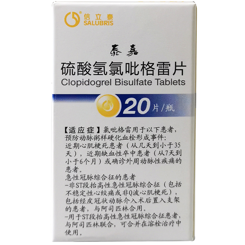 首页>全部商品>专科用药>心脑血管>心脑血管综合用药>泰嘉硫酸氢氯吡格雷片20片